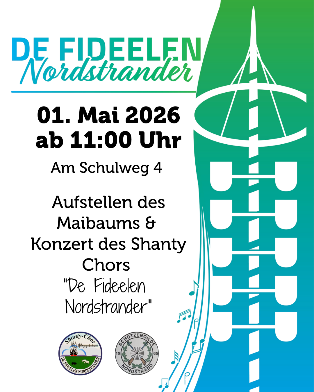 Am Schulweg 4 wird am 01. Mai um 11:00 Uhr traditionell der Maibaum aufgestellt – ein schöner Anlass zum Zusammenkommen und Feiern! Im Anschluss lädt der Shanty Chor „De Fideelen Nordstrander“ zu einem stimmungsvollen Konzert ein.