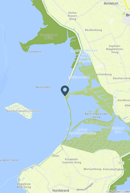 Nordstrandischmoor ist fast 200 ha groß und liegt 3,5 km vor dem Beltringharder Koog. Ca. 20 Einwohner leben in 5 Häusern auf 4 Warften ganzjährig auf der autofreien Hallig, die durch einen Lorendamm mit dem Festland verbunden ist. Die Bewohner können mit ihren Privatloren diesen Damm zur Eigenversorgung nutzen. Die Halligkinder haben ihre eigene Grund- und Hauptschule und einen Lehrer, der auf der Hallig im Schulhaus wohnt. Bei Ebbe kann die Hallig zu Fuß durchs Watt erwandert werden. Ausgangspunkt einer Wattwanderung ist Lüttmoorsiel im Beltringharder Koog, dem größten Naturschutzgebiet in Schleswig-Holstein. Kaum zu glauben, aber dieser Koog gehörte bis 1984 auch noch zum Wattenmeer. Auf dem Weg zur Hallig werden Würmer ausgegraben, Muscheln und Schnecken erklärt und natürlich Jagd auf die Strandkrabben gemacht. Auf der Hallig geht es durch die einzigartige Tier- und Pflanzenwelt zur Neuwarf in die Gaststätte, wo gemütlich bei Essen und Trinken pausiert wird. Eine Wanderung zum denkmalgeschützten Friedhof sowie Informationen runden das Halligbild ab. Nach etwa 2 Stunden Aufenthalt wird der Rückweg zum Festland angetreten.